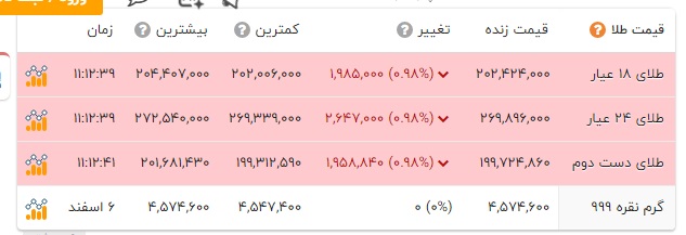 براساس نرخهای اعلامی اتحادیه طلا و جواهر هر گرم طلای ۱۸ عیار امروز پنج شنبه ۷ اسفند ۱۴۰۴ با کاهش ۰.۹۸ درصدی به ۲۰۲.۴۲۴.۰۰۰ ریال رسید. قیمت سکه امامی نیز با کاهش ۰.۲۴ درصدی به ۱.۹۹۵.۲۰۰.۰۰۰ ریال رسید.